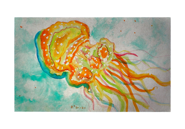 These decorative floor mats are made with a synthetic, low pile washable material. They have a non-slip rubber backing. Our small door mats measure 18x26 and our larger mats measure 30x50. All of our products are based on designs by artists R.B. Hamilton and Betsy Drake and are printed in the USA from imported materials.