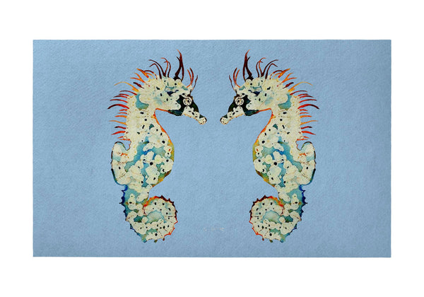 These decorative floor mats are made with a synthetic, low pile washable material. They have a non-slip rubber backing. Our small door mats measure 18x26 and our larger mats measure 30x50. All of our products are based on designs by artists R.B. Hamilton and Betsy Drake and are printed in the USA from imported materials.
