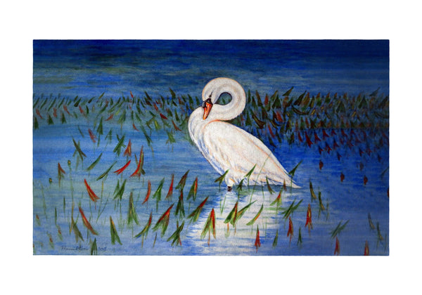 These decorative floor mats are made with a synthetic, low pile washable material. They have a non-slip rubber backing. Our small door mats measure 18x26 and our larger mats measure 30x50. All of our products are based on designs by artists R.B. Hamilton and Betsy Drake and are printed in the USA from imported materials.